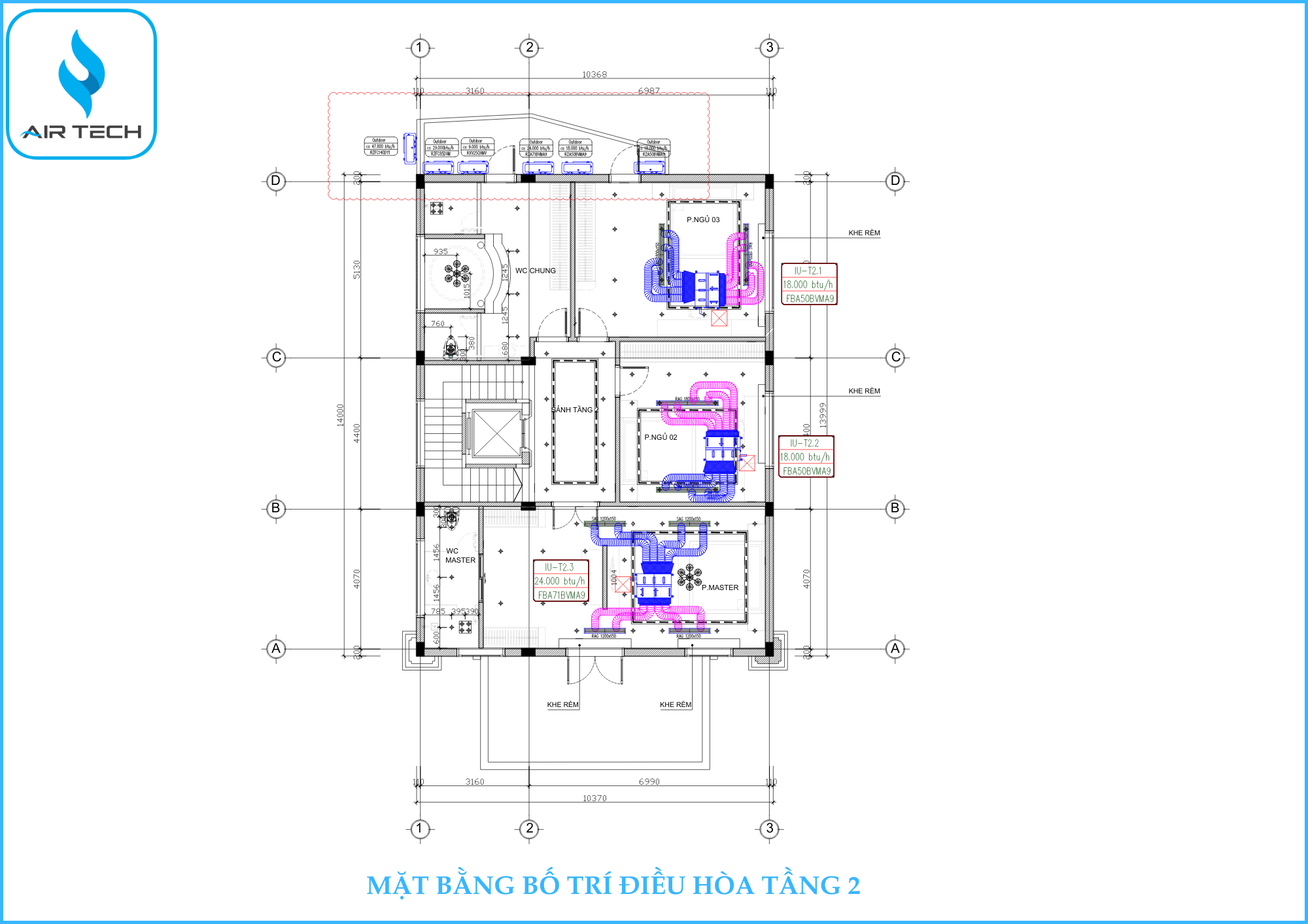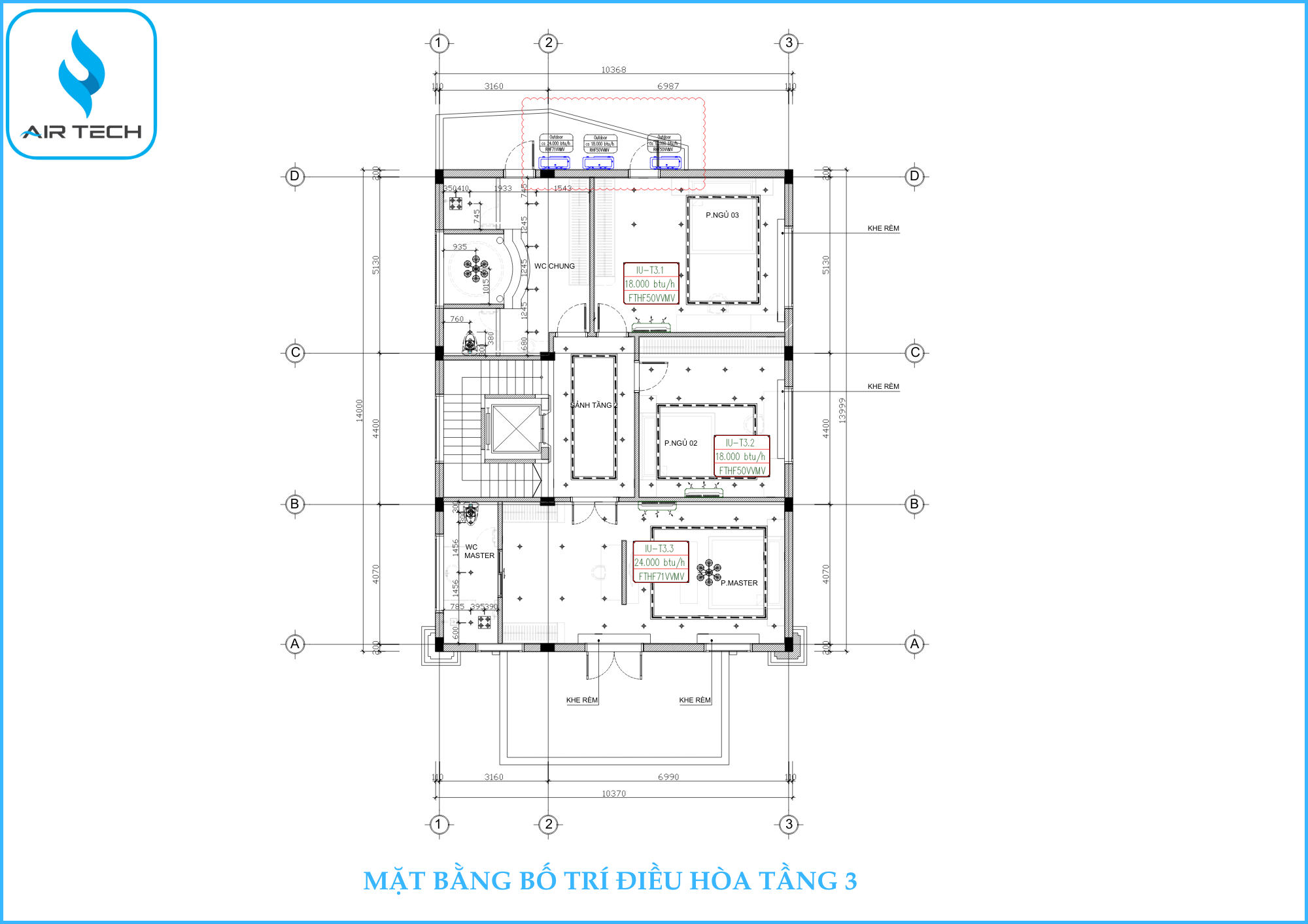 | Mục tiêu thiết kế | Việc phân vùng hệ thống theo từng khu vực nhằm: - Tối ưu công năng sử dụng theo nhu cầu thực tế - Tiết kiệm điện năng nhờ kiểm soát điều hòa từng khu vực - Đảm bảo vận hành liên tục: nếu một hệ gặp sự cố, hệ còn lại vẫn hoạt động bình thường, giúp gia chủ an tâm sử dụng trong khi chờ kỹ thuật AirTech kiểm tra xử lý trong ngày |