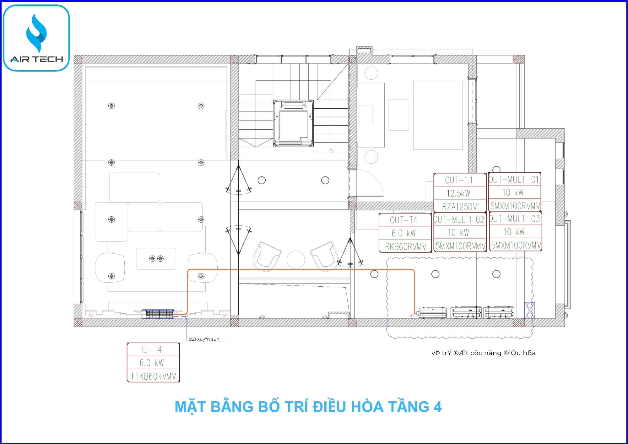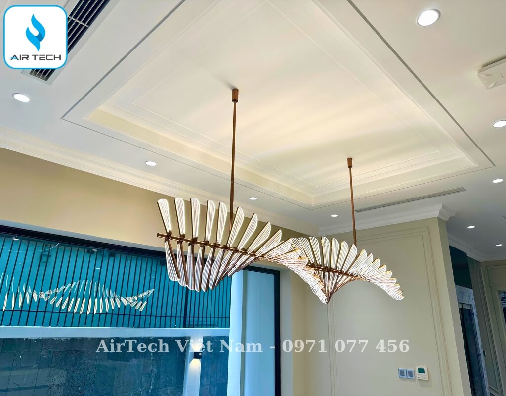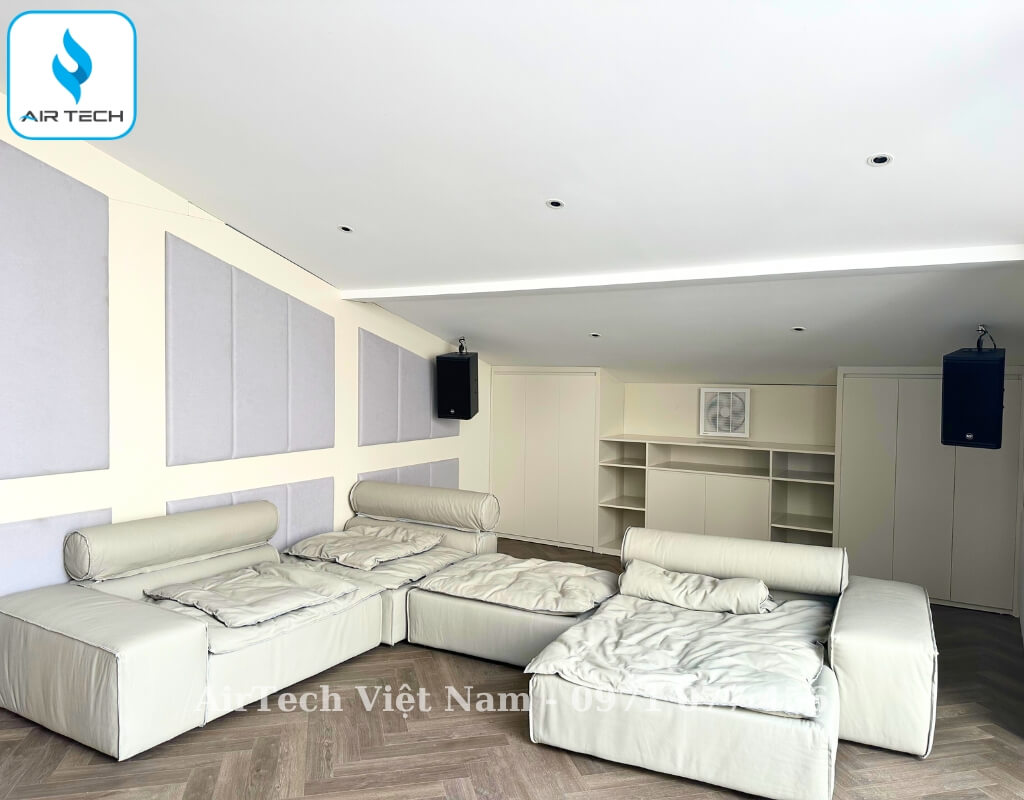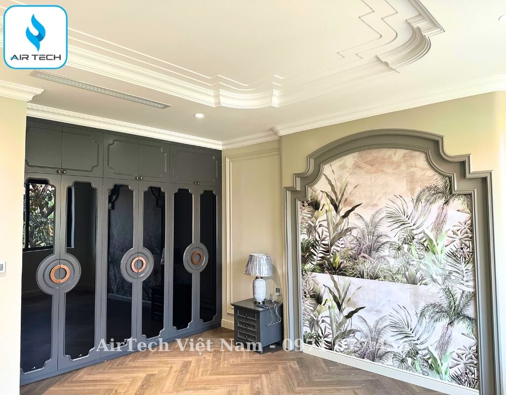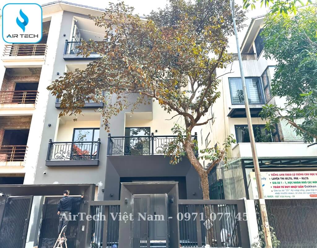| Giải pháp từ AirTech | – Chọn hệ thống điều hòa cục bộ đối với không gian rộng, tách biệt như phòng bếp. Đối với không gian phòng khách sẽ được khéo léo kết hợp cùng 3 tổ Multi gồm những phòng ngủ trên tầng 2 + tầng 3. Riêng không gian giải trí, xem phim trên tầng 4 dùng điều hòa treo tường cục bộ. – Sử dụng dàn lạnh âm trần nối ống gió cục bộ FBA, FMA ,CDXM, đi kèm giải pháp giấu kín thiết bị, chỉ để lộ cửa gió – đảm bảo thẩm mỹ tuyệt đối. – Tích hợp hệ thống cấp khí tươi thu hồi nhiệt, lọc bụi mịn PM2.5, Cacbon, đo CO₂ – phù hợp tiêu chuẩn sống cao cấp và sức khỏe người sử dụng. – Tính toán công suất chính xác theo từng phòng và diện tích sử dụng, giúp tối ưu điện năng và giảm chi phí đầu tư. – Thiết kế bản vẽ chi tiết: đường ống đồng, ống gió, điện điều khiển, đảm bảo đồng bộ giữa các giai đoạn thi công (phần thô – hoàn thiện). |